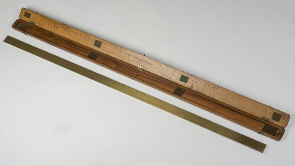 Le mètre, défini en 1791 par l’Académie des sciences de Paris comme étant la dix millionième partie du quart du méridien terrestre, est officiellement reconnu comme l’étalon de longueur de référence. Dans la foulée, le Bureau international des poids et mesures (BIPM) est fondé à Paris. Il est chargé de construire des nouveaux étalons primaires basés sur l’étalon originel, de les conserver dans les meilleures conditions possibles et d’en distribuer des copies auprès de tous les états membres. Ainsi, la Suisse reçoit en 1889 la copie n°2 du mètre étalon et la copie n°38 du kilo étalon, aujourd’hui conservés à l’Institut fédéral de métrologie METAS dans le canton de Berne.