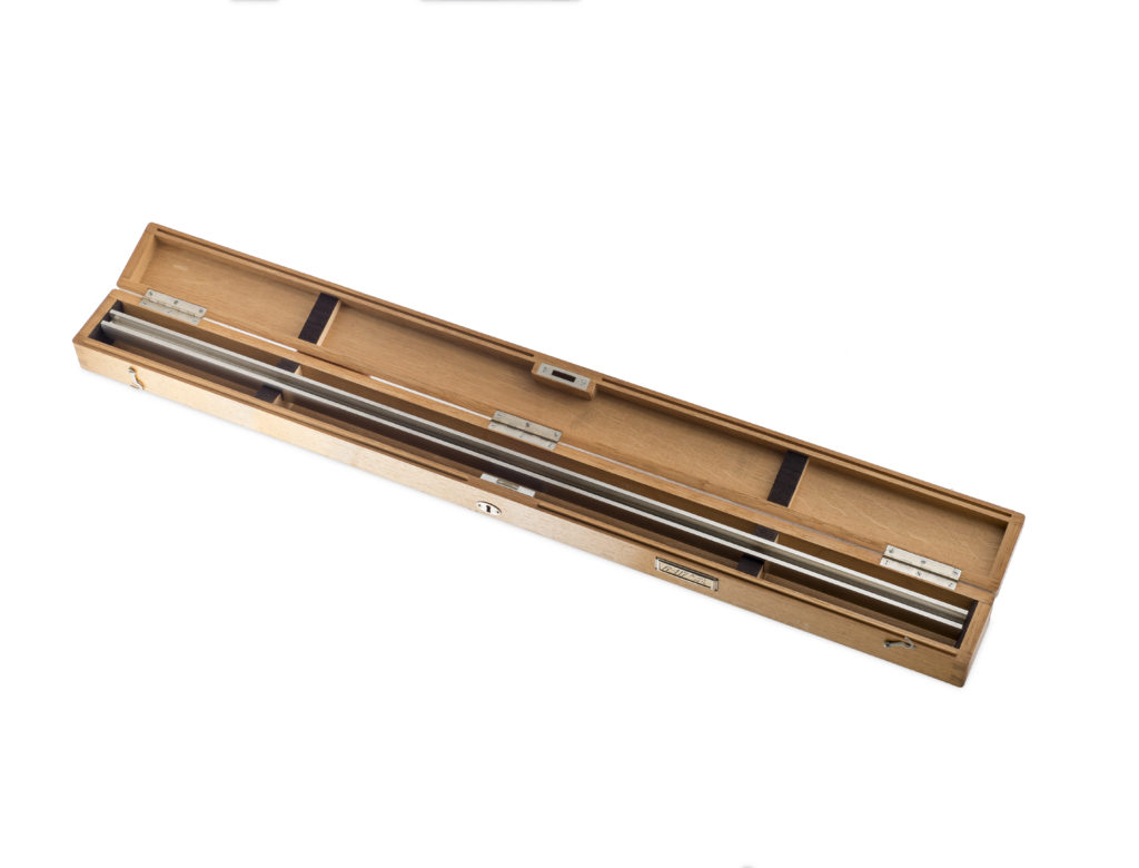 Suite à la signature de la convention du mètre, la Suisse reçoit en 1889 la copie n°2 du mètre étalon qui est aujourd’hui conservée dans les laboratoires de l’Institut fédéral de métrologie METAS à Berne. Sur le certificat délivré par le Bureau international des poids et mesures, on lit que le mètre prototype n°2 est en alliage de platine irridié contenant 10% d’irridium. Il a été construit par la firme Johnson Matthey & Cie à Londres, puis poli et coupé à la longueur de 102 cm par Brunner frères à Paris. Le traçage a été effectué par Gustave Tresca, ingénieur rattaché à la section française de la commission du mètre. La section transversale de la règle est en forme de X. A chaque extrémité sont gravés trois traits d’une épaisseur de 6 à 8 microns séparés les uns des autres par des intervalles de 0,5mm. La distance entre les traits moyens de ces deux groupes représente la longueur de 1000mm. La règle porte sur la face supérieure des jambages l’inscription « A2 » et « B2 ». A côté de l’inscription « A2 » est gravé « SIP Genève 1971 », ce qui pourrait signifier que l’entreprise genevoise a procédé au regravage du prototype en 1971 comme elle l’avait déjà fait dès 1939 pour les prototypes du BIPM de Paris.